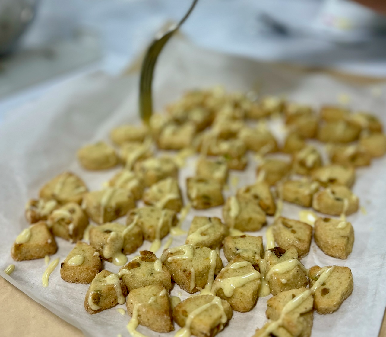 Set the wire rack of cooled shortbread over the parchment-lined baking sheet. Dip each shortbread so that it's half covered in glaze, then top with pistachios while the glaze is still soft (you can dip a few shortbread, top them off, and repeat). Alternatively, drizzle the glaze decoratively over the cookies and sprinkle with sparkling sugar while the glaze is still soft. Set the cookies aside for the glaze to firm up.